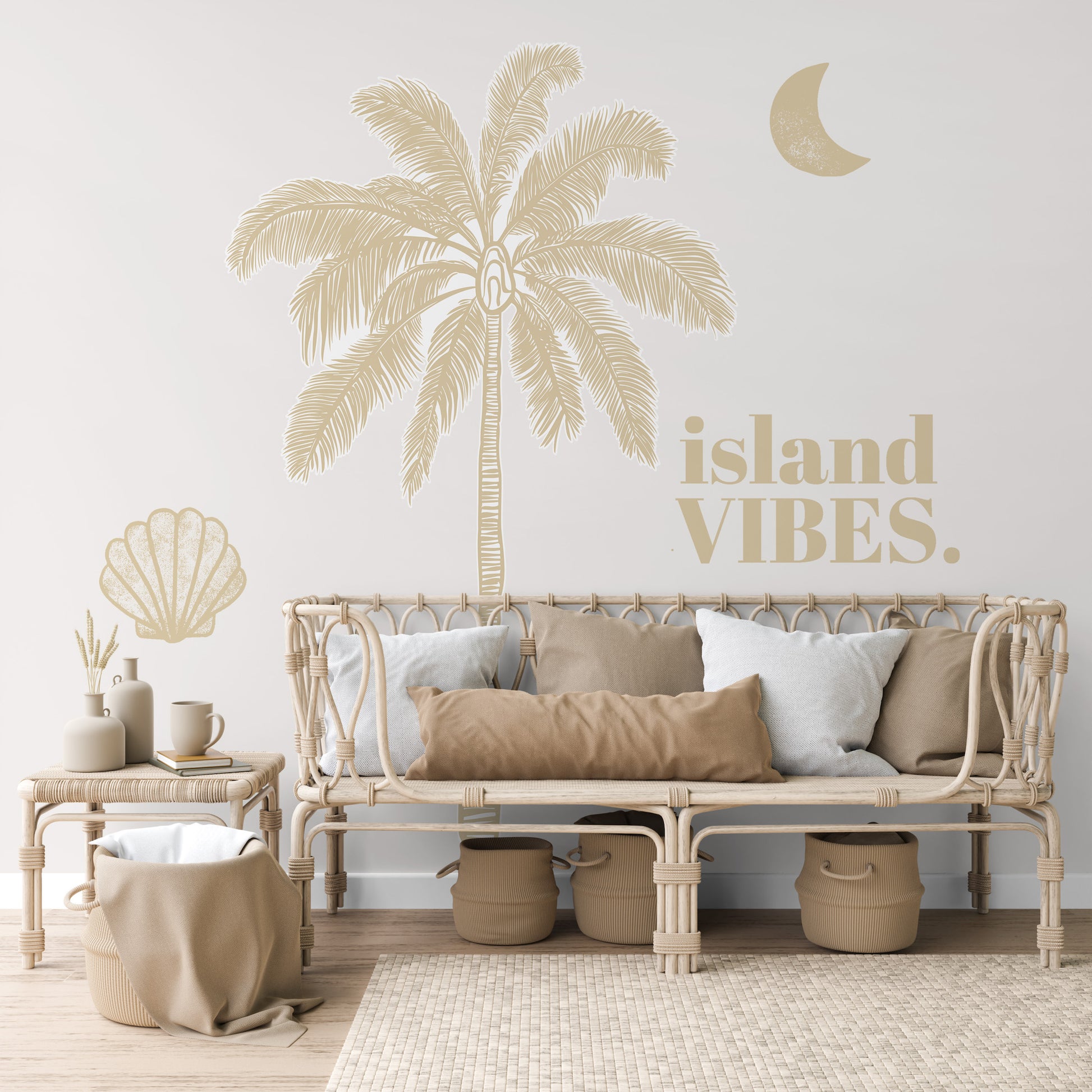 Contents: 1 large palm tree, 1 seashell, 1 moon & words ‘island vibes’